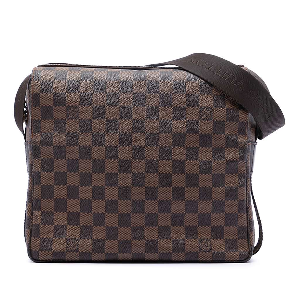 The Naviglio features a damier ebene canvas body, a flat strap, a flap with snap closure, a top zip closure, and an interior slip pocket.