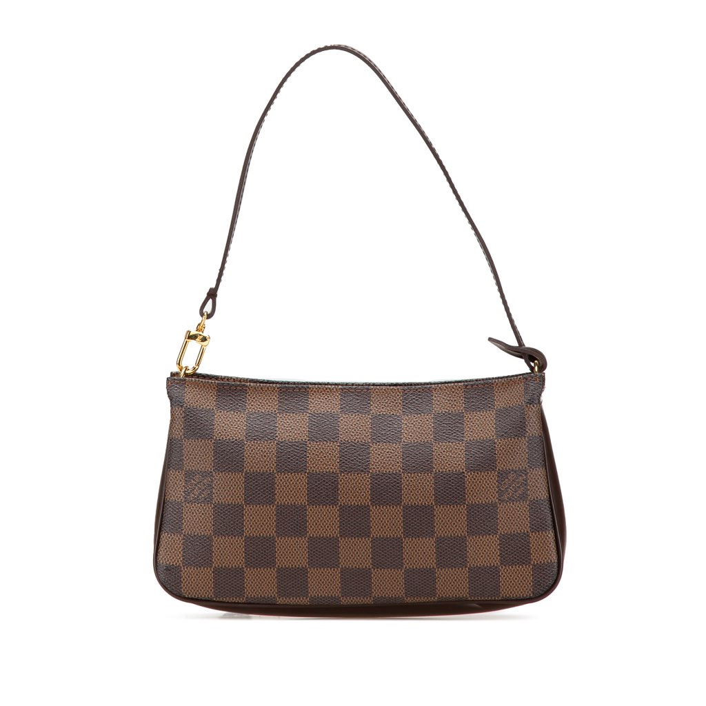 The Navona features a damier ebene canvas body with leather trim, a flat leather handle, and a top zip closure.