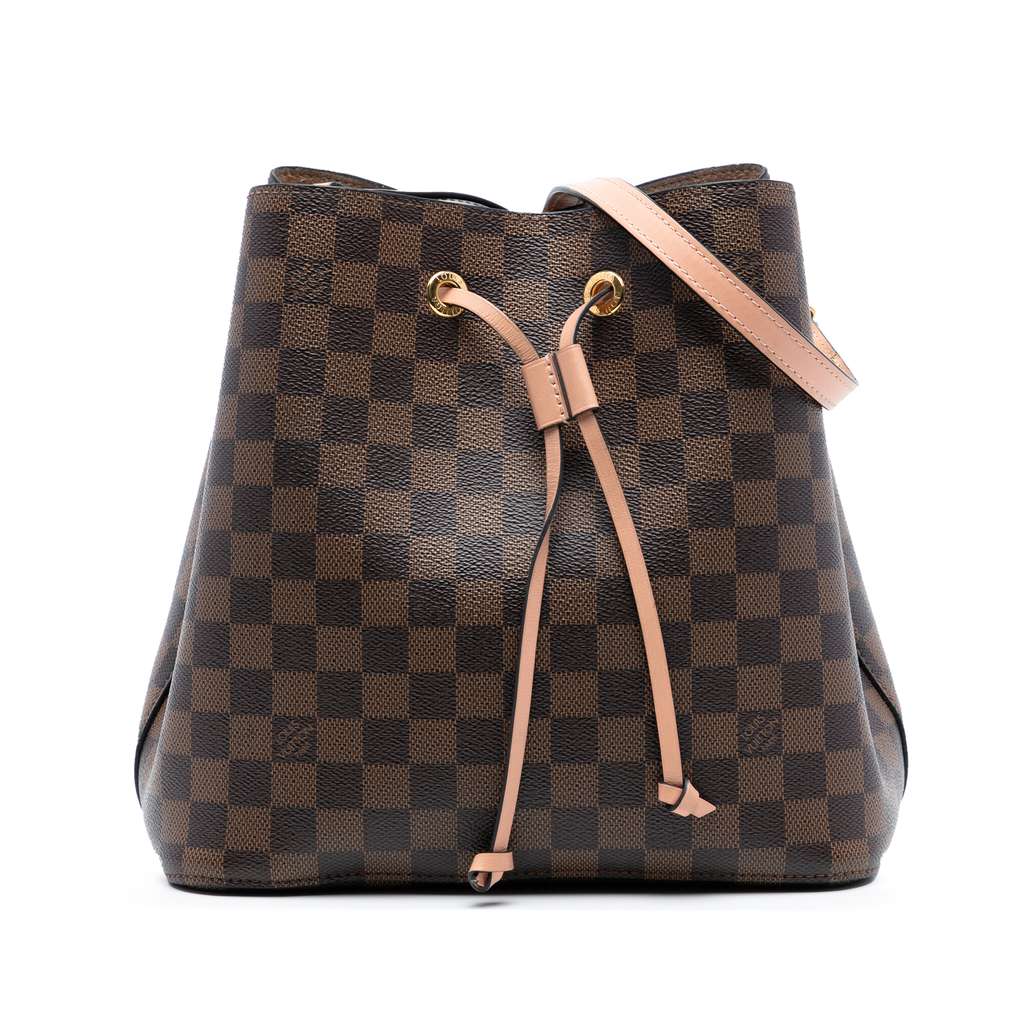 The Neonoe features a damier ebene canvas body, a flat leather strap, a drawstring closure, and an interior zip pocket.