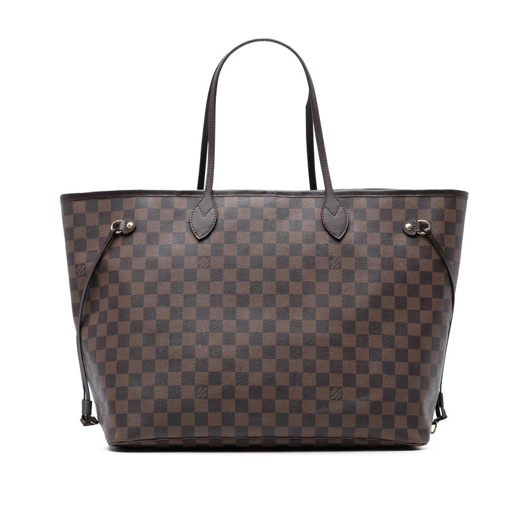 The Neverfull GM features a damier ebene canvas body with leather trim, flat leather shoulder straps, an open top with a lobster clasp closure, and an interior zip pocket.