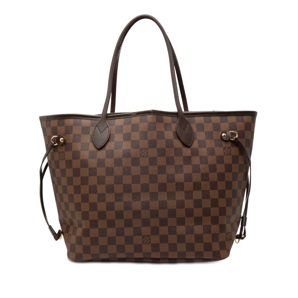 The Neverfull MM features the damier ebene canvas body with leather trim, flat leather shoulder straps, an open top with lobster hook closure, and an interior zip pocket.