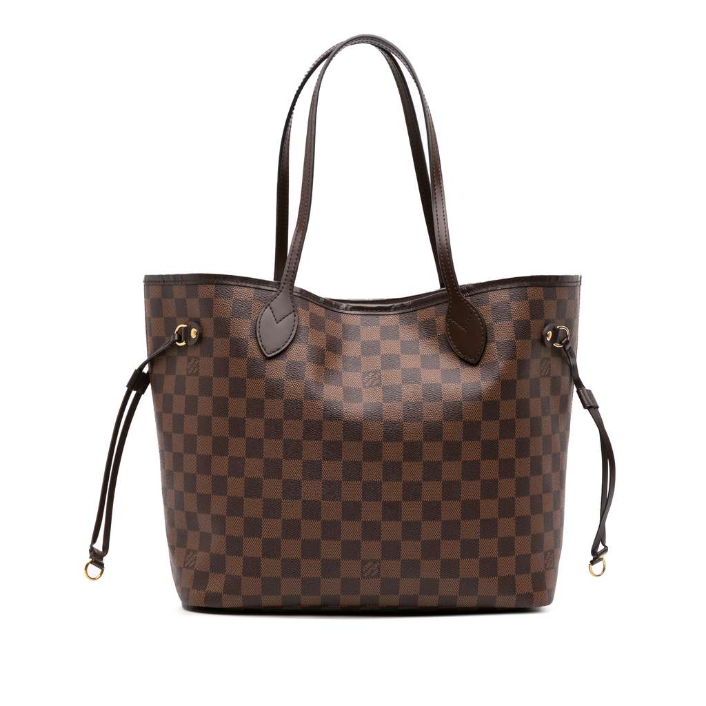 The Neverfull MM features the damier canvas body with leather trim, flat leather shoulder straps, an open top with lobster claw hook closure, and an interior zip pocket.