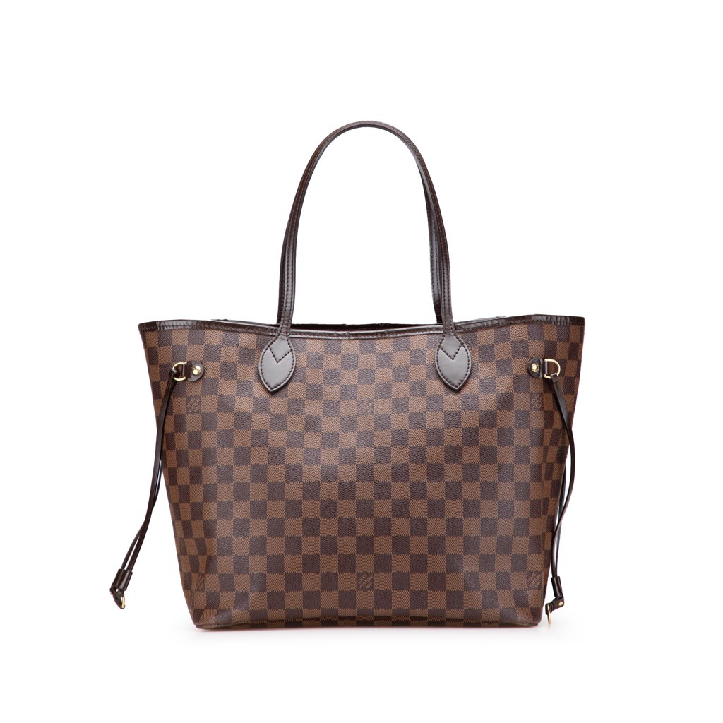 The Neverfull MM features a damier ebene canvas body with leather trim, flat leather shoulder straps, an open top with lobster clasp closure, and an interior zip pocket.