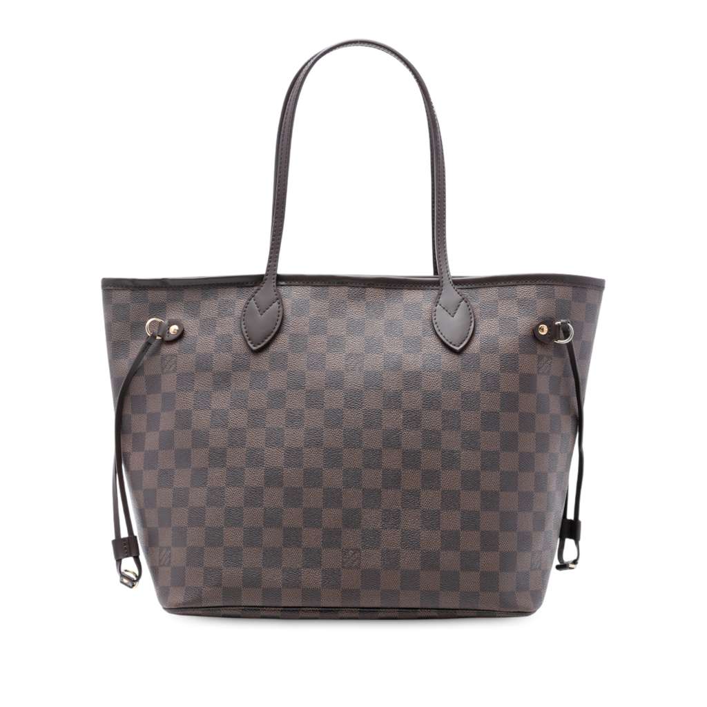 The Neverfull MM features a damier canvas body with leather trim, flat leather shoulder straps, an open top with lobster claw hook closure, and an interior zip pocket.