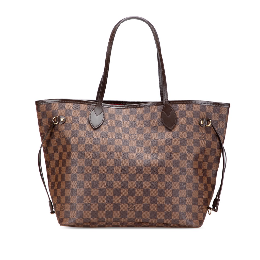 The Neverfull MM features a damier ebene canvas body with leather trim, flat leather shoulder straps, an open top with a lobster clasp closure, and an interior zip pocket.
