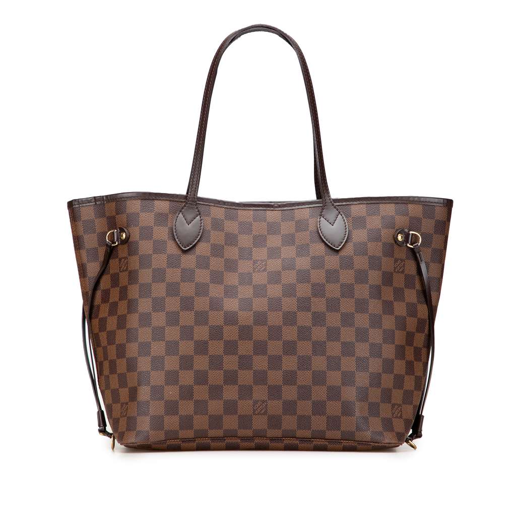 The Neverfull MM features a damier ebene canvas body with leather trim, flat leather shoulder straps, an open top with lobster hook closure, and an interior zip pocket.