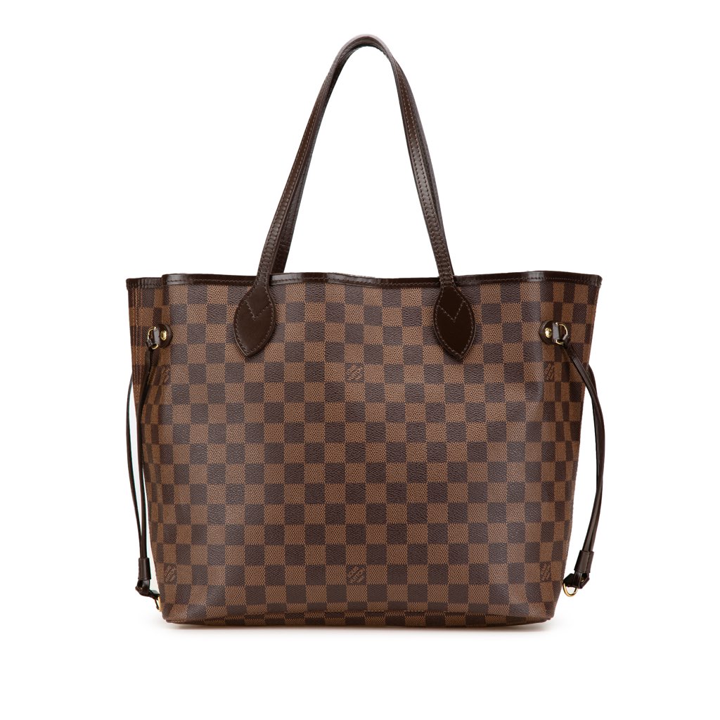 The Neverfull features the damier canvas body with leather trim, flat leather shoulder straps, an open top with lobster claw hook closure, and an interior zip pocket.