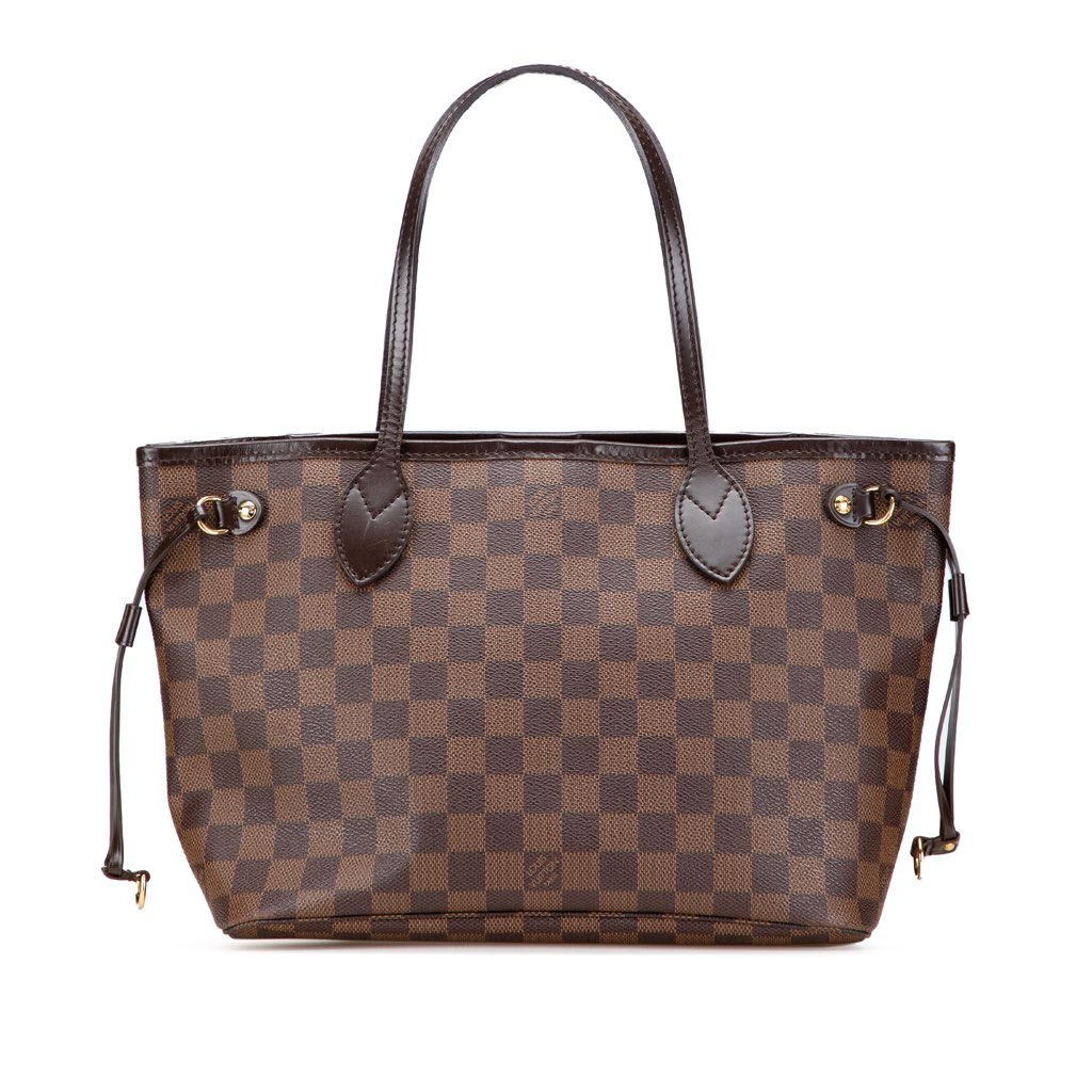 The Neverfull PM features a damier ebene canvas body with leather trim, flat leather straps, a top lobster clasp closure, and an interior zip pocket.