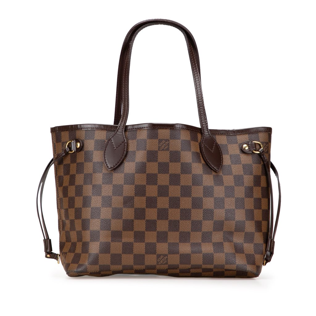 The Neverfull PM features a damier ebene canvas body with leather trim, flat leather straps, a top lobster clasp closure, and an interior zip pocket.