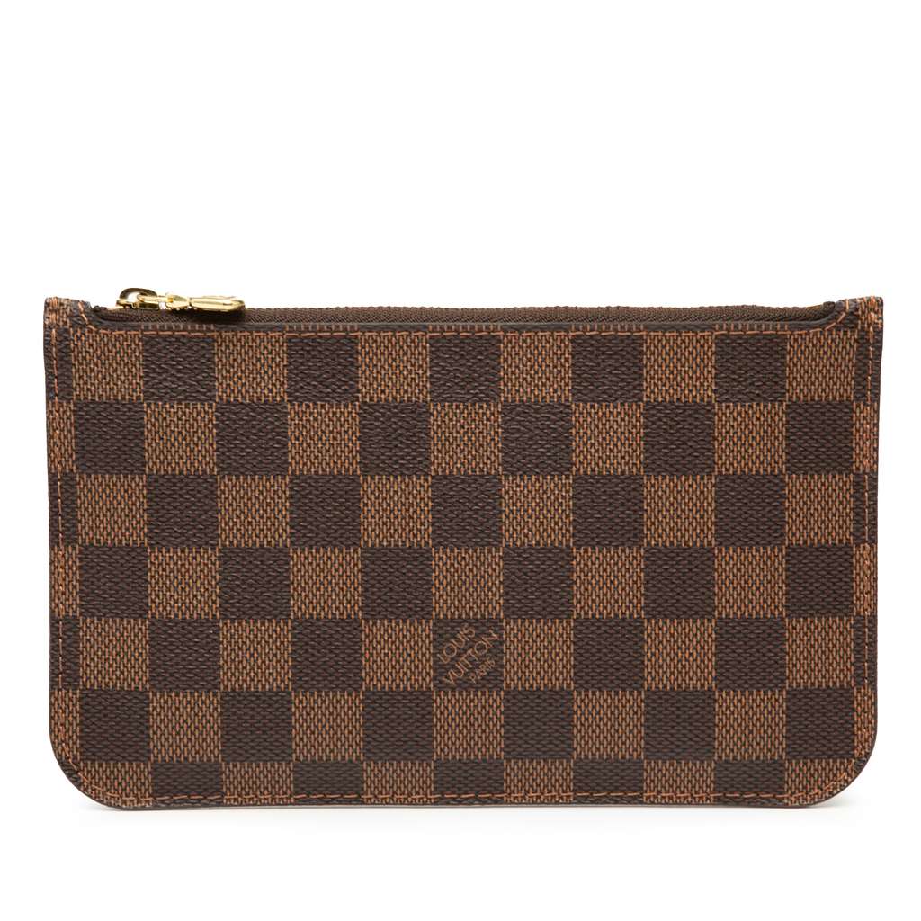 The Neverfull PM Pouch features a damier ebene canvas body, a top zip closure, and an interior slip pocket.