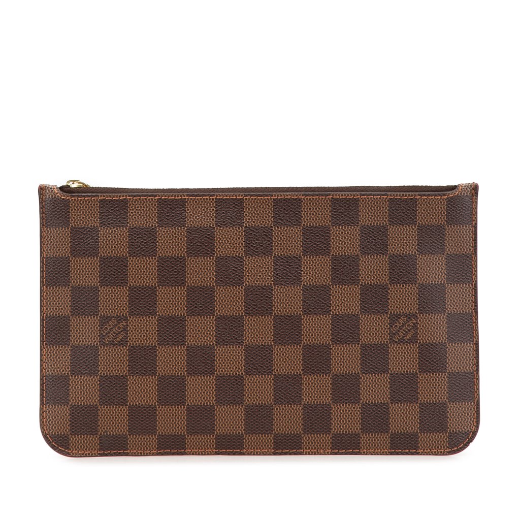 This pouch features a damier ebene canvas body, a top zip closure, and an interior slip pocket.