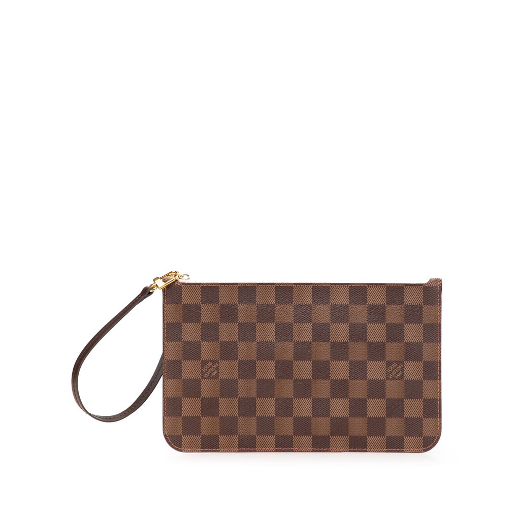This pouch features a damier ebene canvas body, a flat leather wrist strap, a top zip closure, and an interior slip pocket.