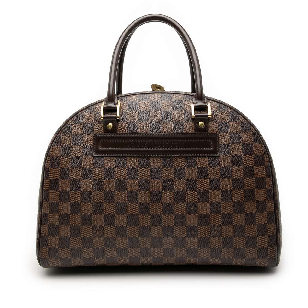 The Nolita features a damier ebene body with leather trim, rolled leather handles, a top zip closure, an exterior zip pocket, and interior zip and slip pockets.