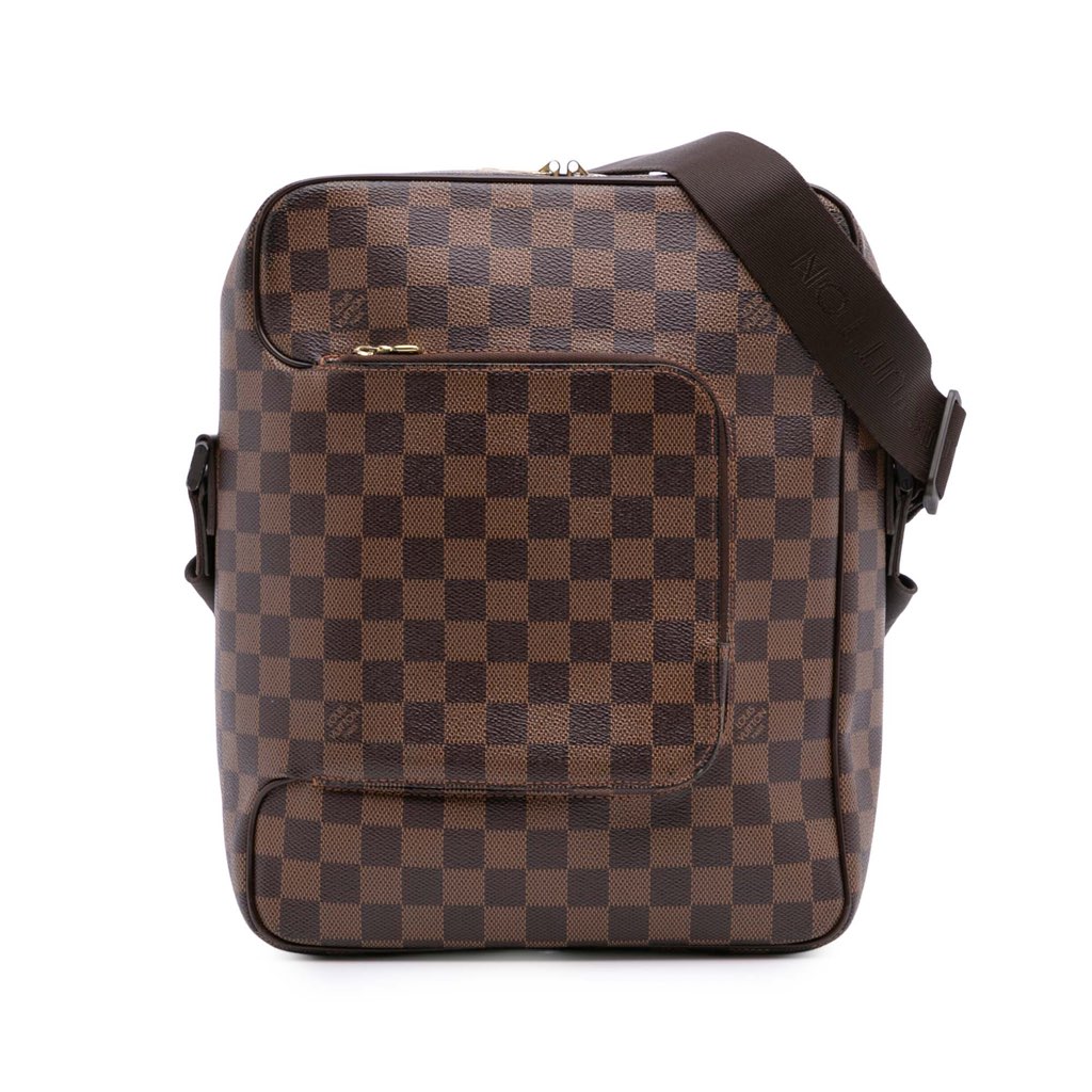 The Olav MM features a damier ebene canvas body, an adjustable flat strap, exterior front and back zip pockets, a top zip closure, and an interior slip pocket.