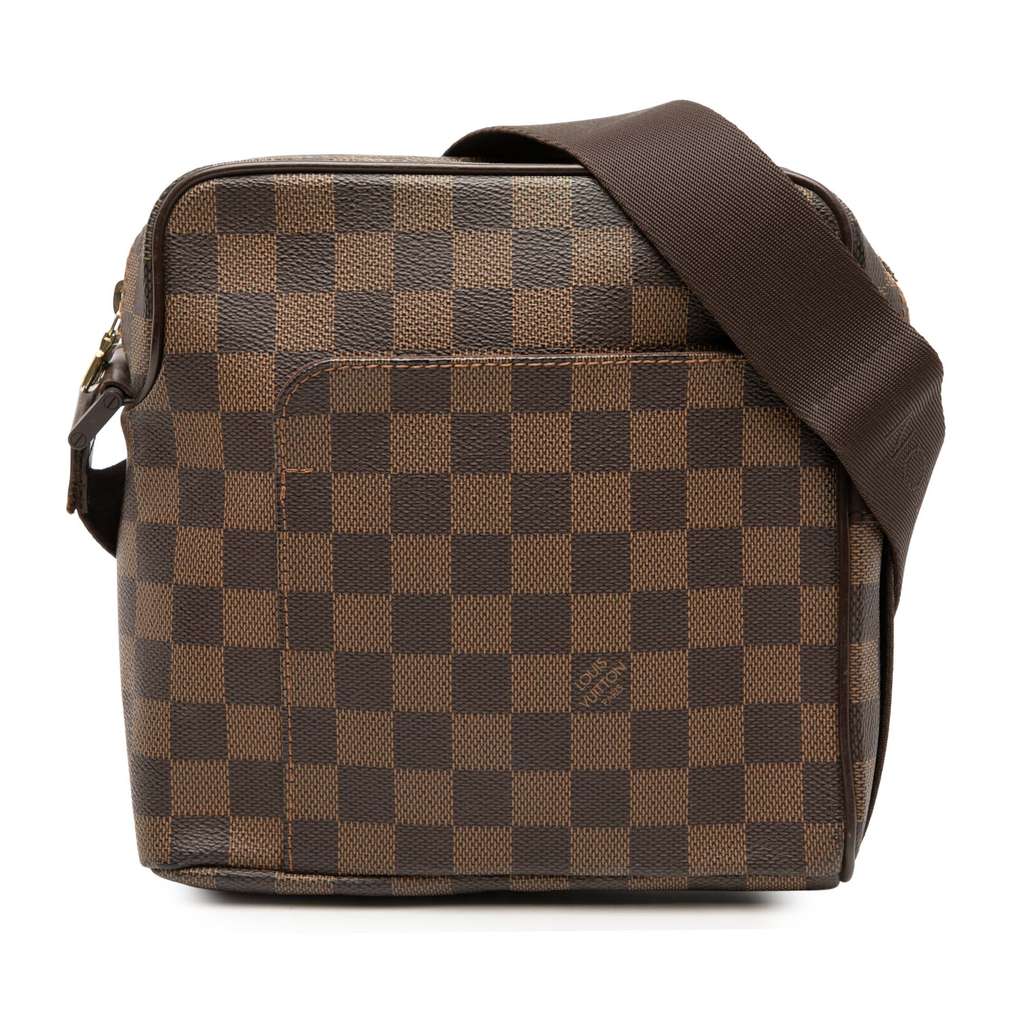 The Olav PM features a damier ebene canvas body with leather trim, an adjustable flat strap, a top zip closure, an exterior front slip pocket, and an interior slip pocket.