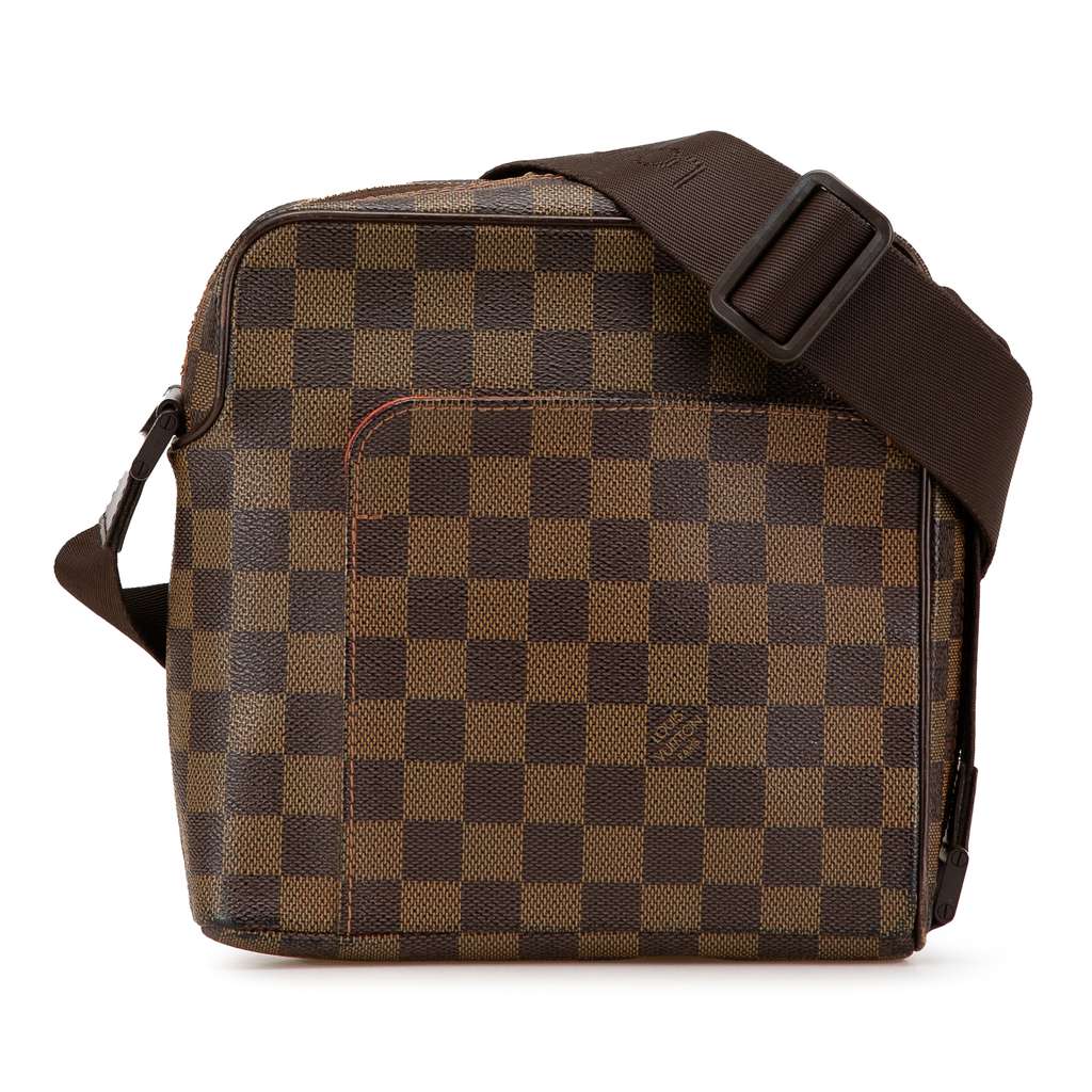 The Olav PM features a damier ebene canvas body with leather trim, an adjustable flat strap, a top zip closure, an exterior front slip pocket, and an interior slip pocket.