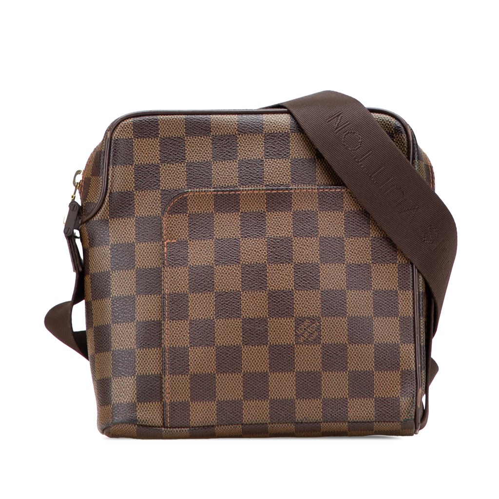 The Olav PM features a damier ebene canvas body with leather trim, an adjustable flat strap, a top zip closure, a front exterior slip pocket, and an interior slip pocket.
