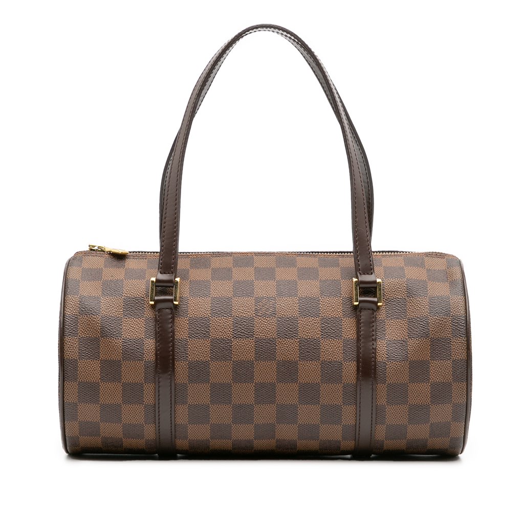 The Papillon 30 features a damier ebene canvas body with leather trim, flat leather straps, and a top zip closure.
