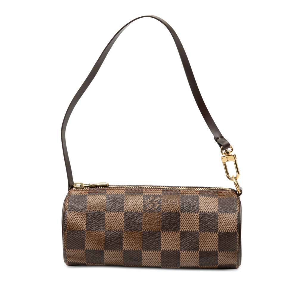 The Pochette Papillon features a damier canvas body with leather trim, a flat leather strap, and a top zip closure.