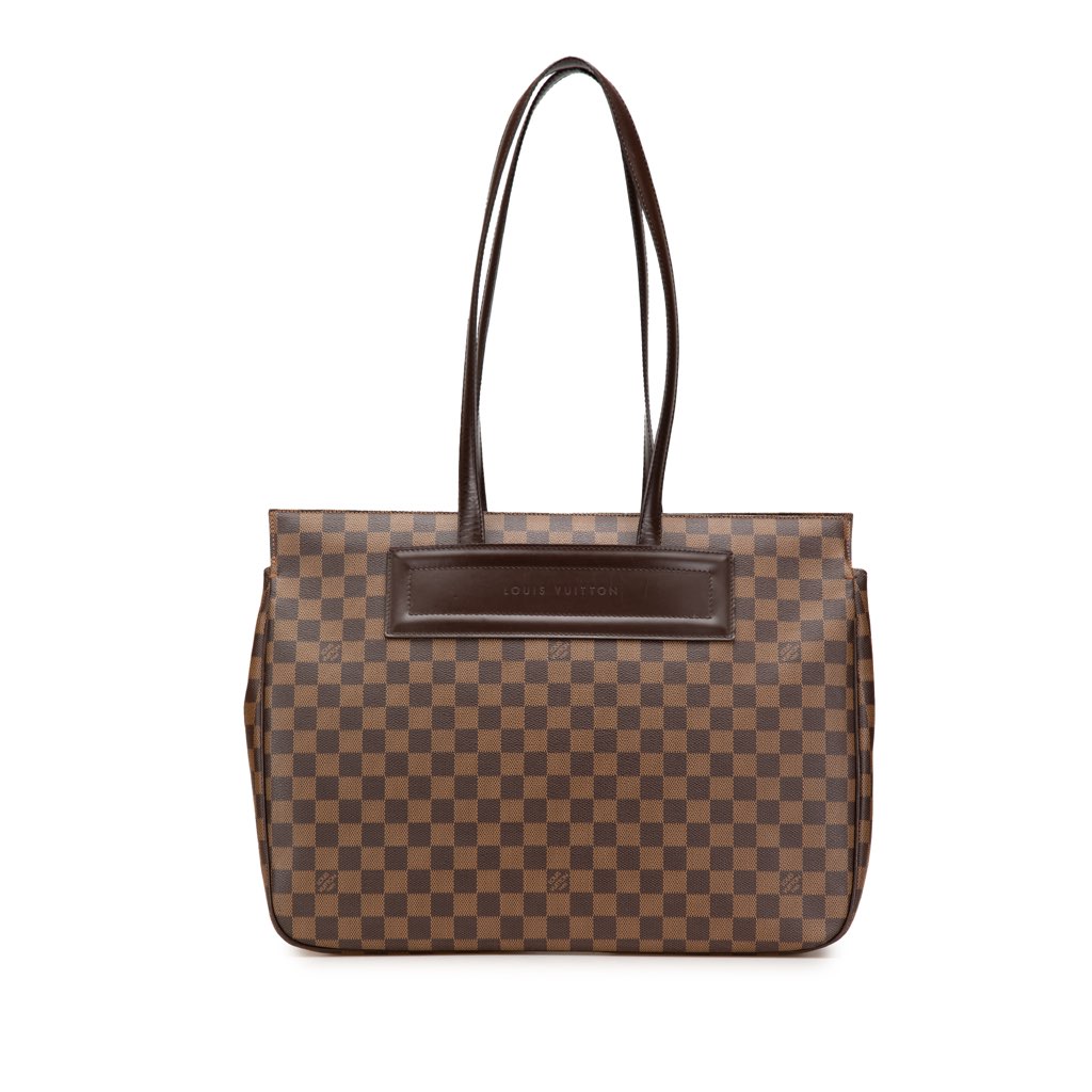 The Parioli GM features a damier ebene canvas body with leather trim, flat leather straps, an open top, an exterior slip pocket, and interior slip pockets.