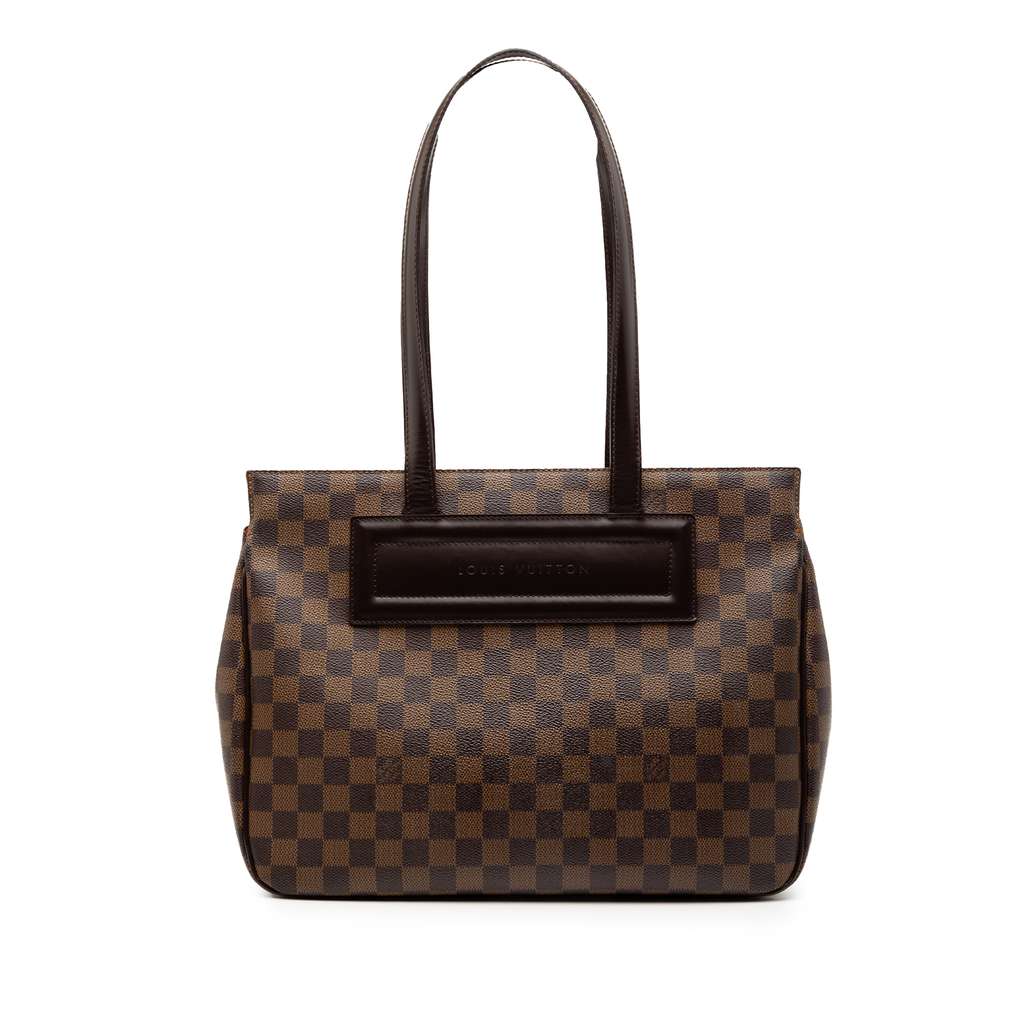The Parioli PM features a damier ebene canvas body, flat leather straps, an open top with magnetic snap closure, and interior slip pockets.