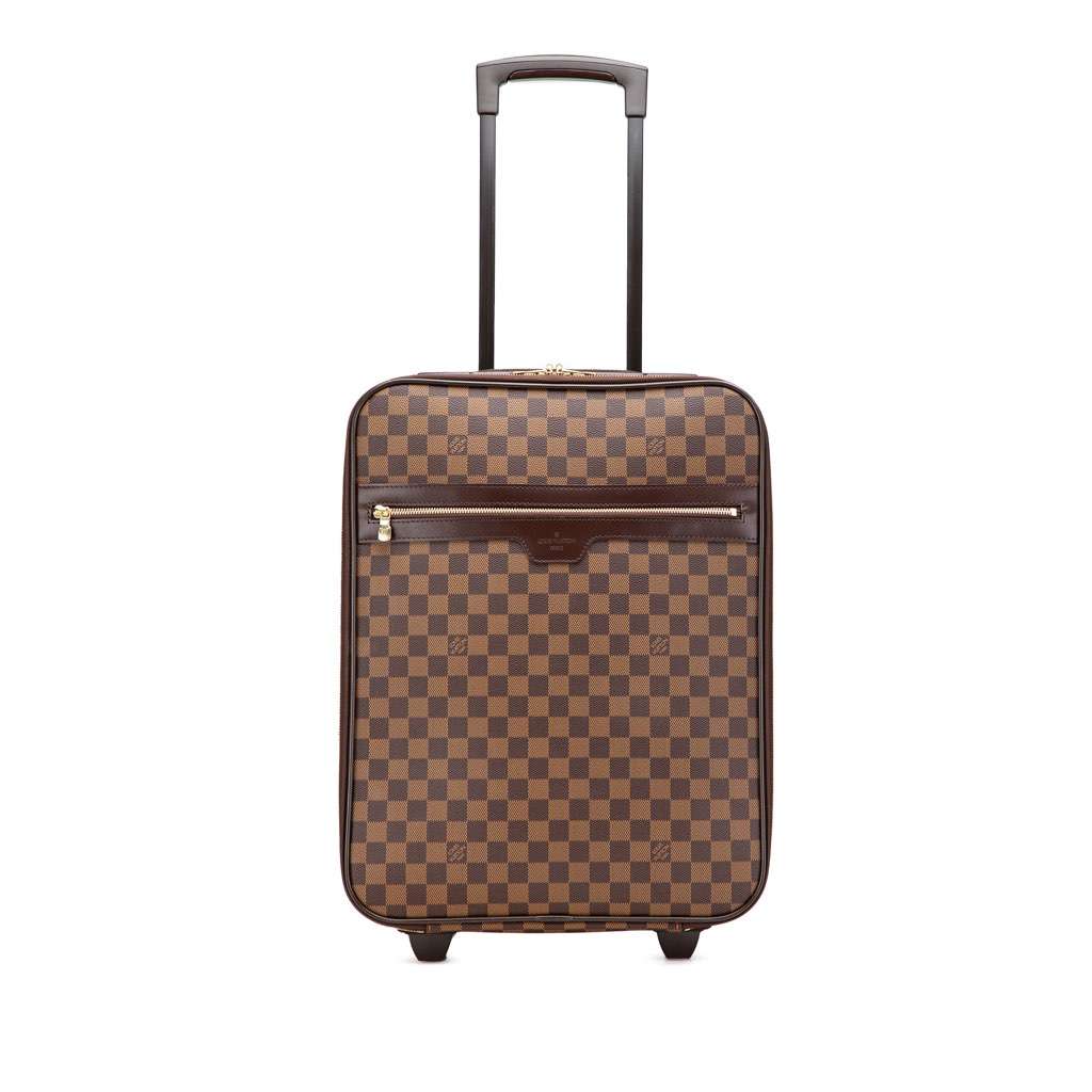 The Pegase 45 features a damier ebene canvas body with leather trim, a flat leather top handle, a retractable top handle, dual wheels, a zip-around closure, an exterior front zip pocket, and an interior zip pocket.