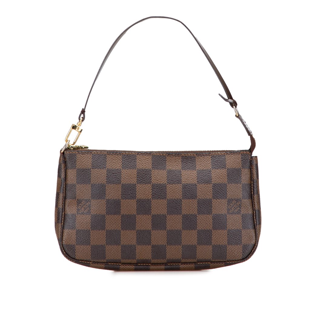 The Pochette Accessoires features a damier ebene canvas body, a flat leather handle, and a top zip closure.