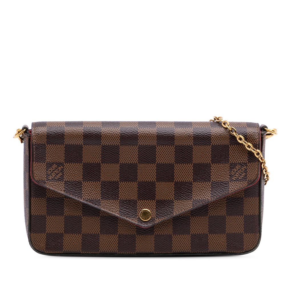 The Pochette Felicie crossbody bag features a damier ebene canvas body, a detachable gold-tone chain link shoulder strap, a top flap with a snap button closure, an interior slip pocket, and a pouch inclusion.