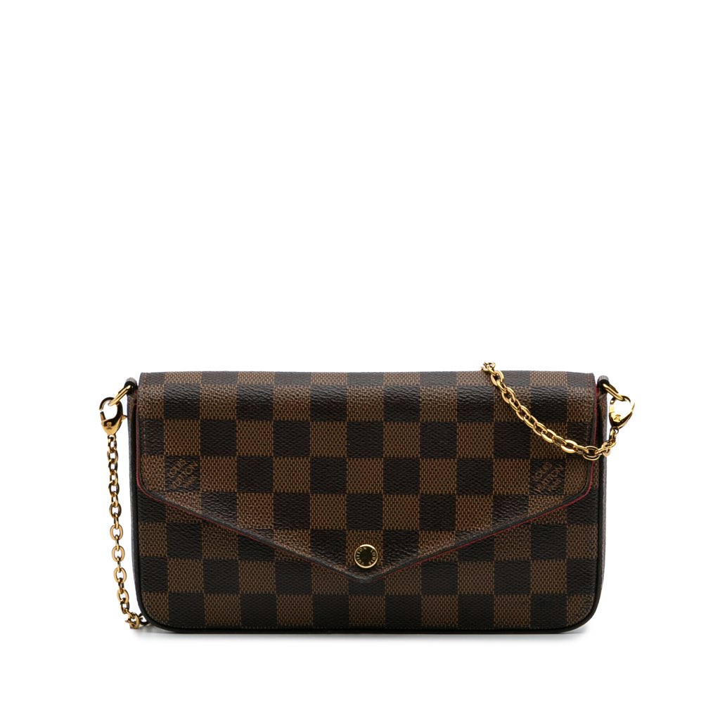 The Pochette Felicie crossbody bag features a damier ebene canvas body, a detachable gold-tone chain link shoulder strap, a top flap with snap closure, and an interior slip pocket.