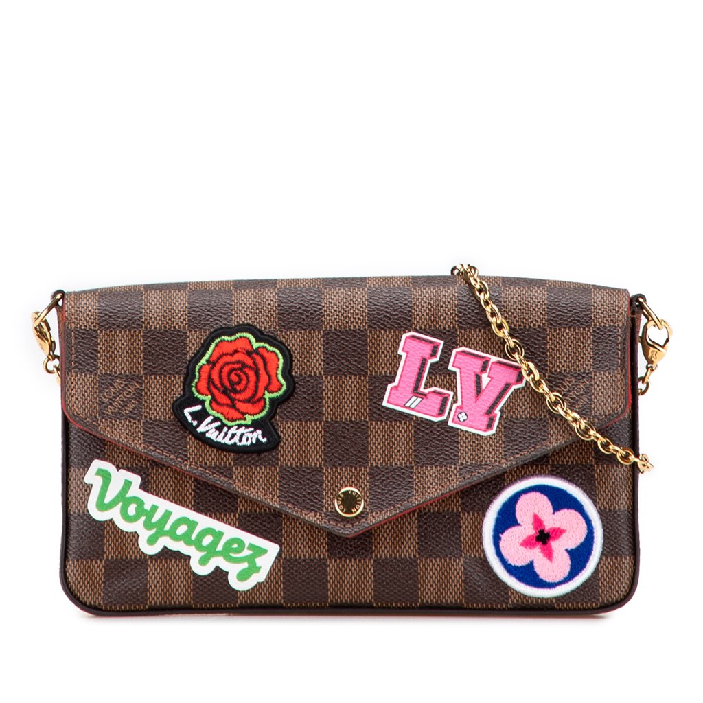 The Pochette Felicie features a damier canvas body with patch details, a detachable chain link strap, a front flap with snap button closure, an interior slip pocket, and pouch inclusions.