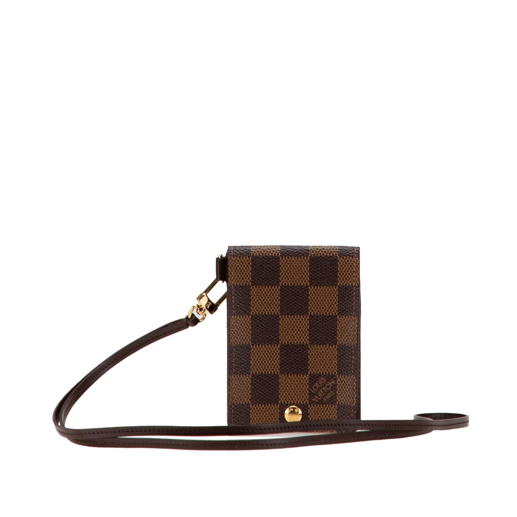 This crossbody features a damier ebene canvas body, a detachable flat leather strap, a snap closure, exterior slip pockets, and an interior card slot.