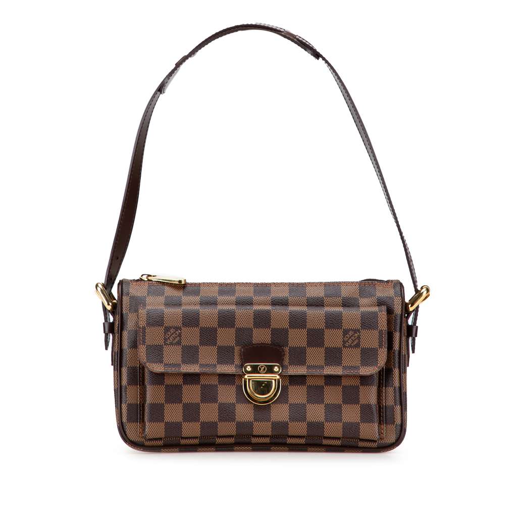 The Ravello GM features a damier ebene canvas body with leather trim, a flat leather shoulder strap, a top zip closure, a front flap pocket with a push lock closure, and an interior slip pocket.