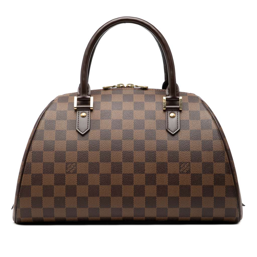 The Ribera MM features a damier ebene canvas body, rolled leather handles, a top zip closure, and interior slip pockets.