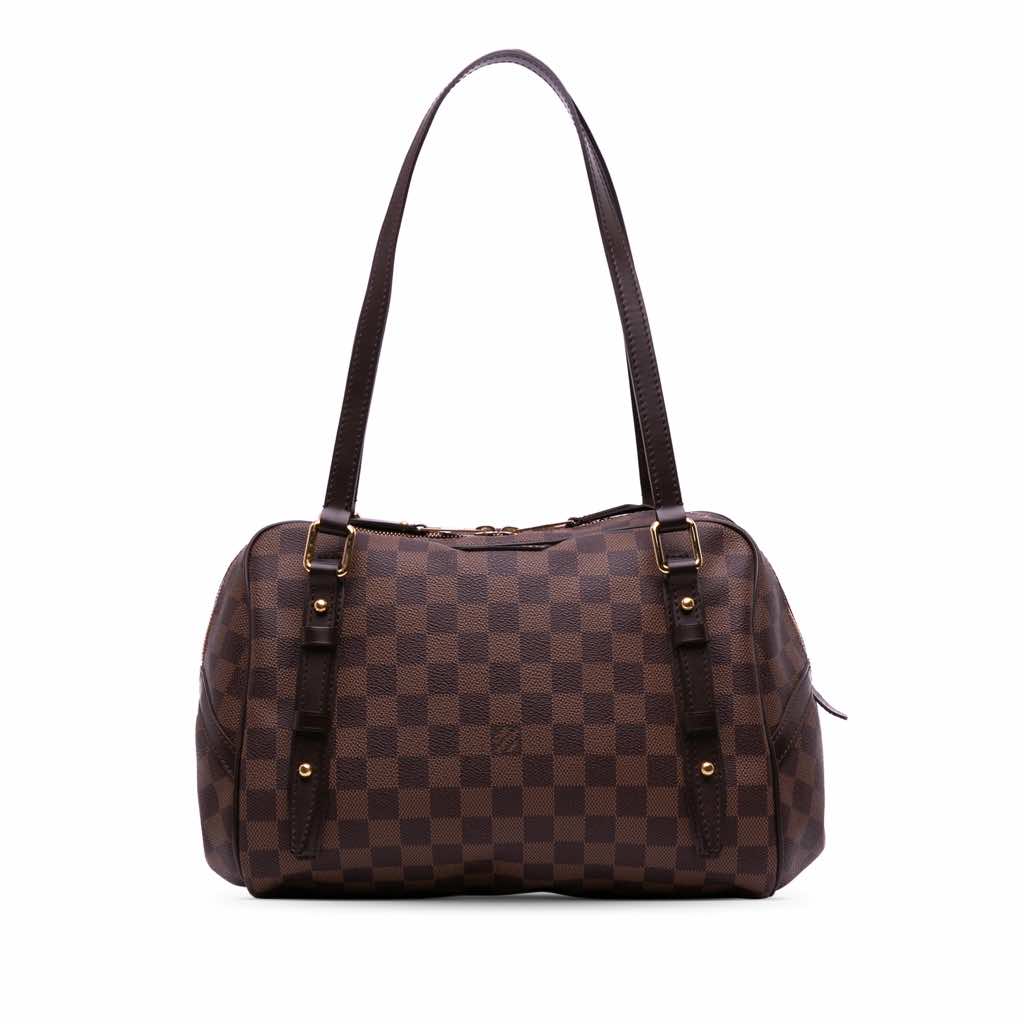 The Rivington GM features a damier canvas body with leather trim, flat leather straps, a two way top zip closure, and an interior slip pocket.