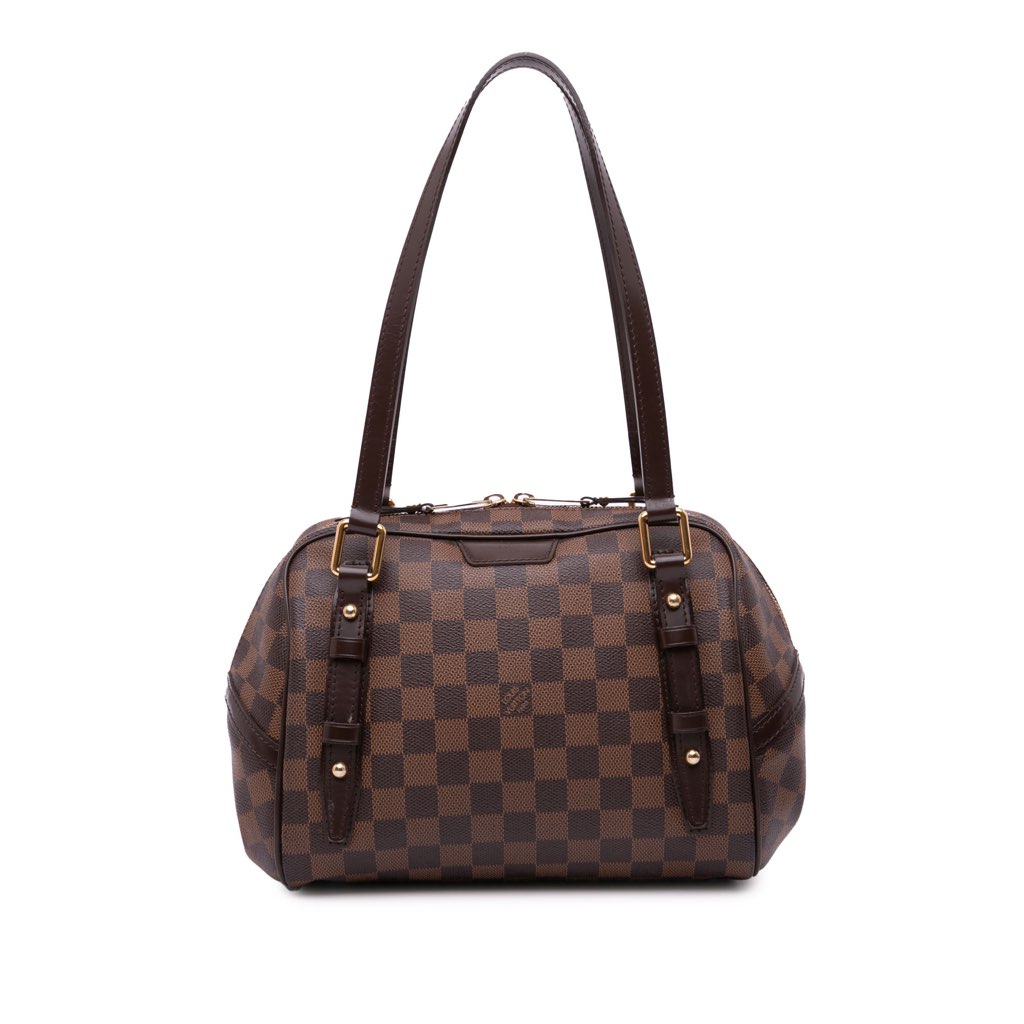 The Rivington PM features a damier ebene canvas body with leather trim, flat leather straps, a two-way top zip closure, and an interior slip pocket.