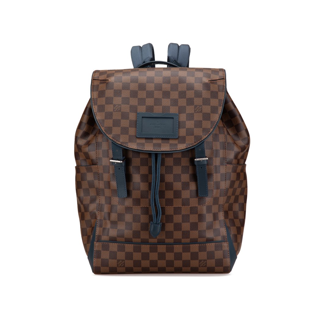 The Runner features a damier ebene canvas body, a flat leather top handle, adjustable flat back straps, a top flap with buckles and leather drawstring closures, and interior zip and slip pockets.