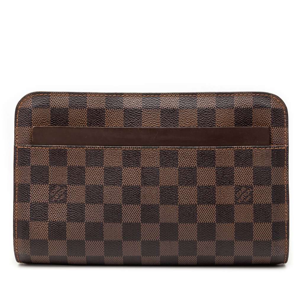 The Saint Paul features a damier canvas body with leather trim, a top zip closure, an exterior slip pocket, and an interior slip pocket.