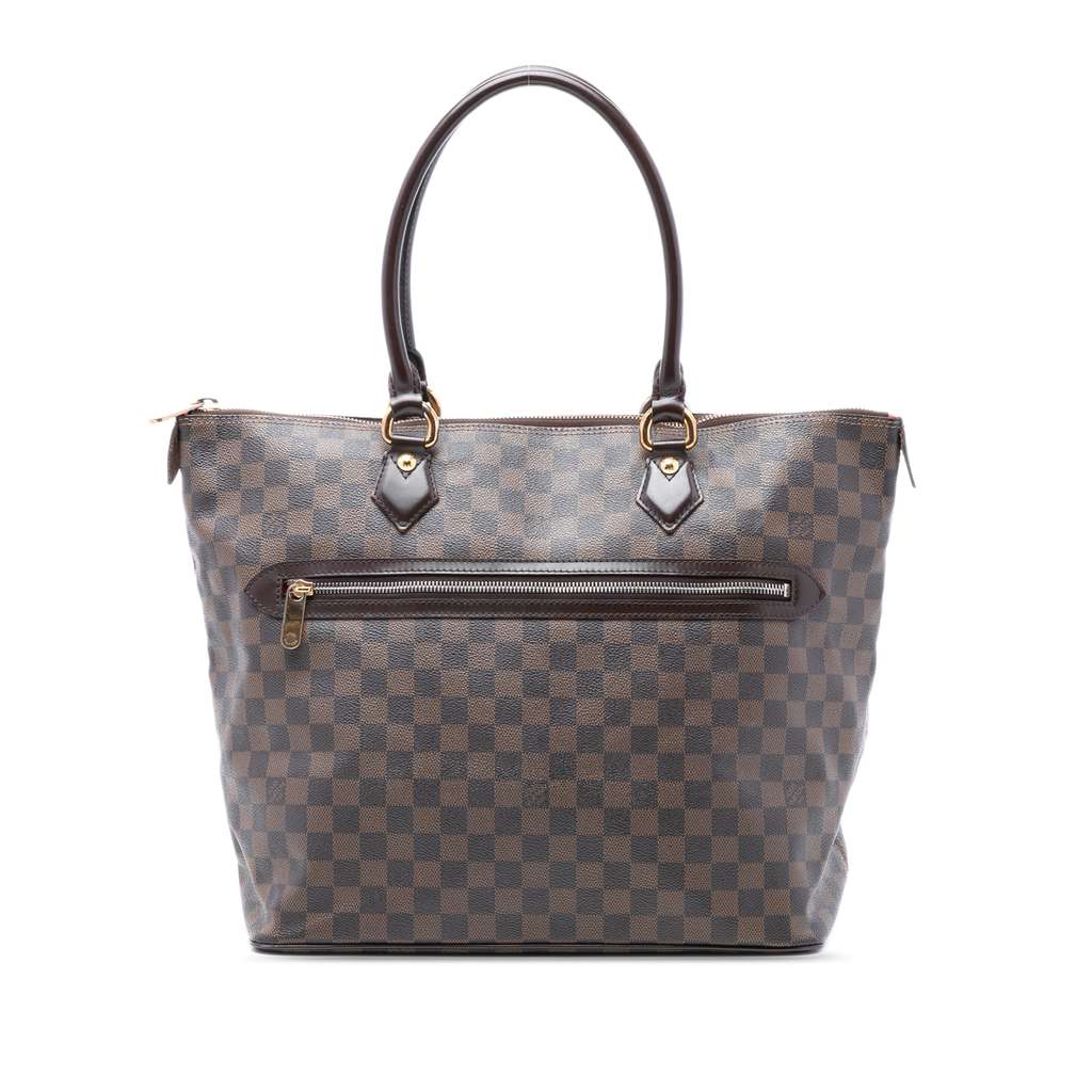 The Saleya GM features a damier ebene canvas body, an exterior front zip pocket, rolled leather straps, a top zip closure, and an interior zip pocket.