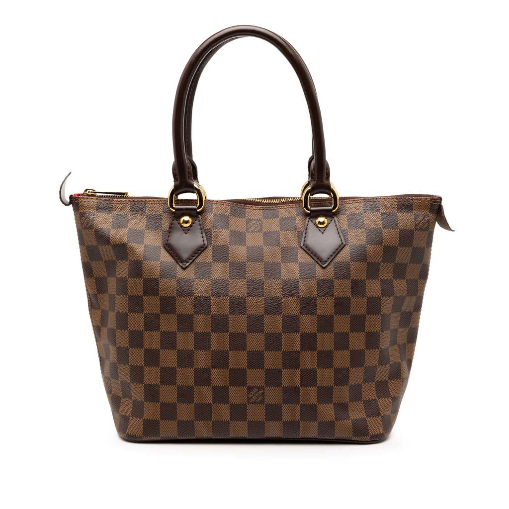 The Saleya PM features a damier ebene canvas body, rolled leather straps, a top zip closure, and interior zip pocket.