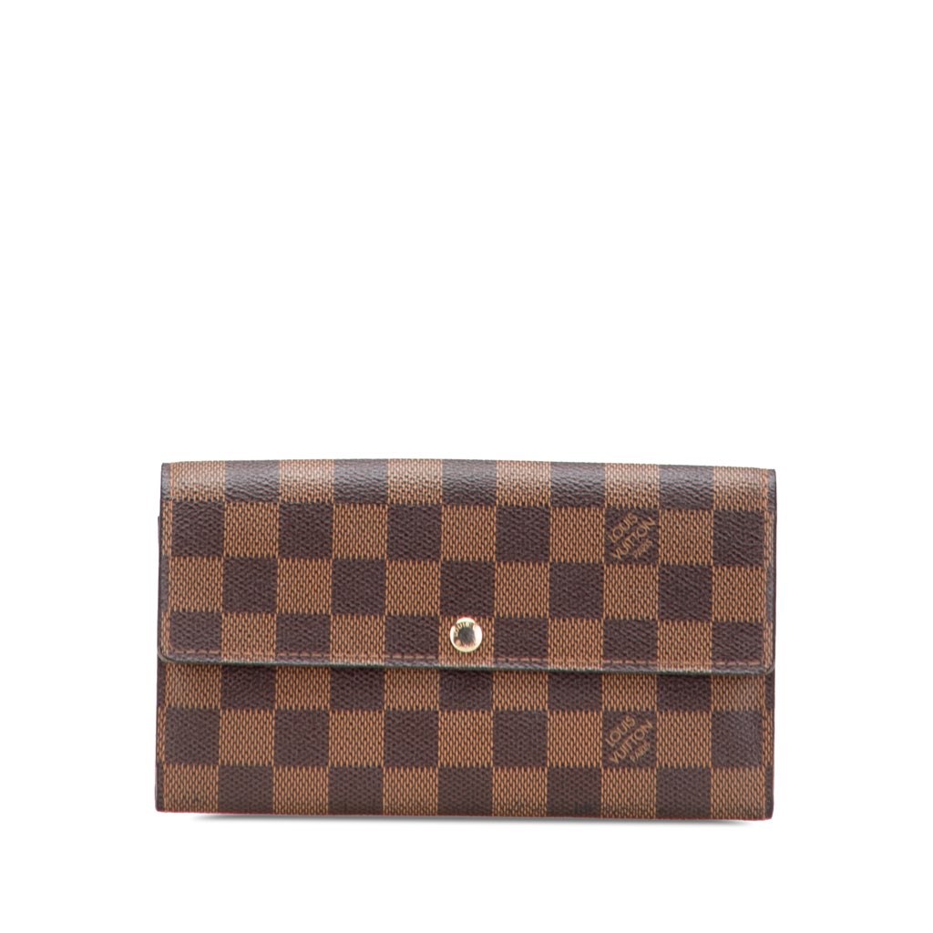 The Sarah wallet features a damier ebene canvas body, a front flap with snap button closure, an interior zip compartment, and interior slip pockets.