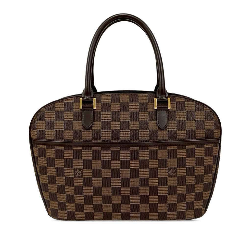 The Sarria Horizontal features a damier ebene canvas body with leather trim, rolled leather handles, a top zip closure, an exterior open pocket, and interior slip pockets.