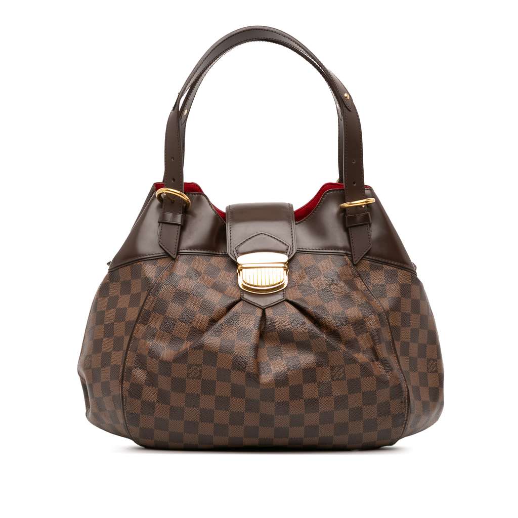 The Sistina GM features a damier ebene canvas body with leather trim, flat leather handles, an open top with a front strap and a push lock closure, an interior zip compartment, and interior slip pockets.