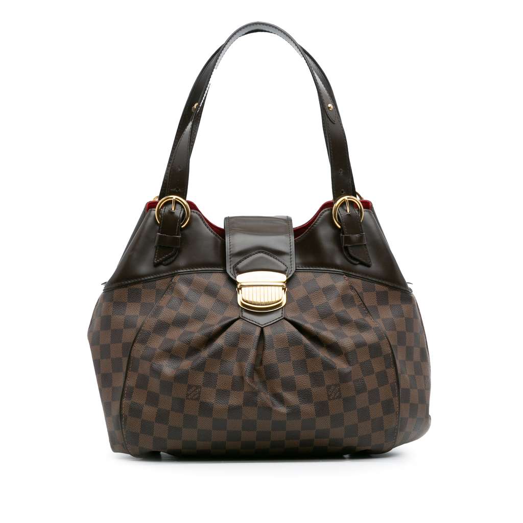 The Sistina GM features a damier ebene canvas body with leather trim, flat leather handles, front strap with push lock closure, an interior zip compartment, and interior open pockets.