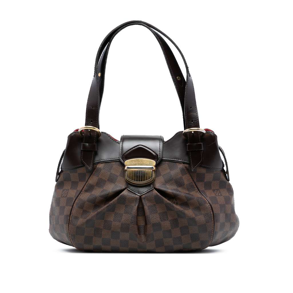 The Sistina PM features a damier canvas body, flat leather handles, top strap with push lock closure, an interior zip compartment, and interior open pockets.