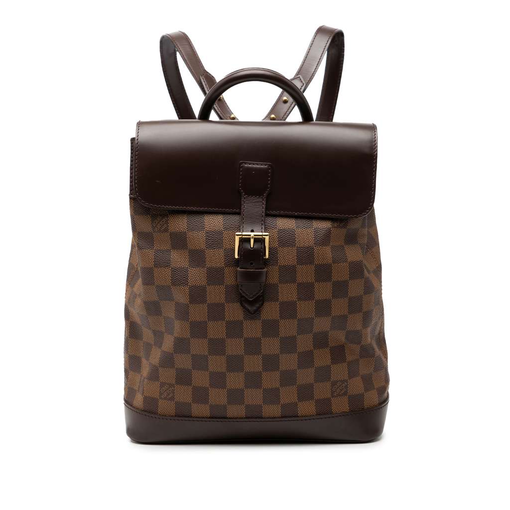 The Soho Backpack features a damier ebene canvas body, rolled leather handle, flat leather back straps, top flap with buckle closure, and interior slip pocket.