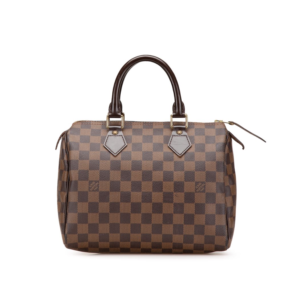 This Speedy features a Damier Ebene Canvas body, rolled leather handles, and top zip closure.