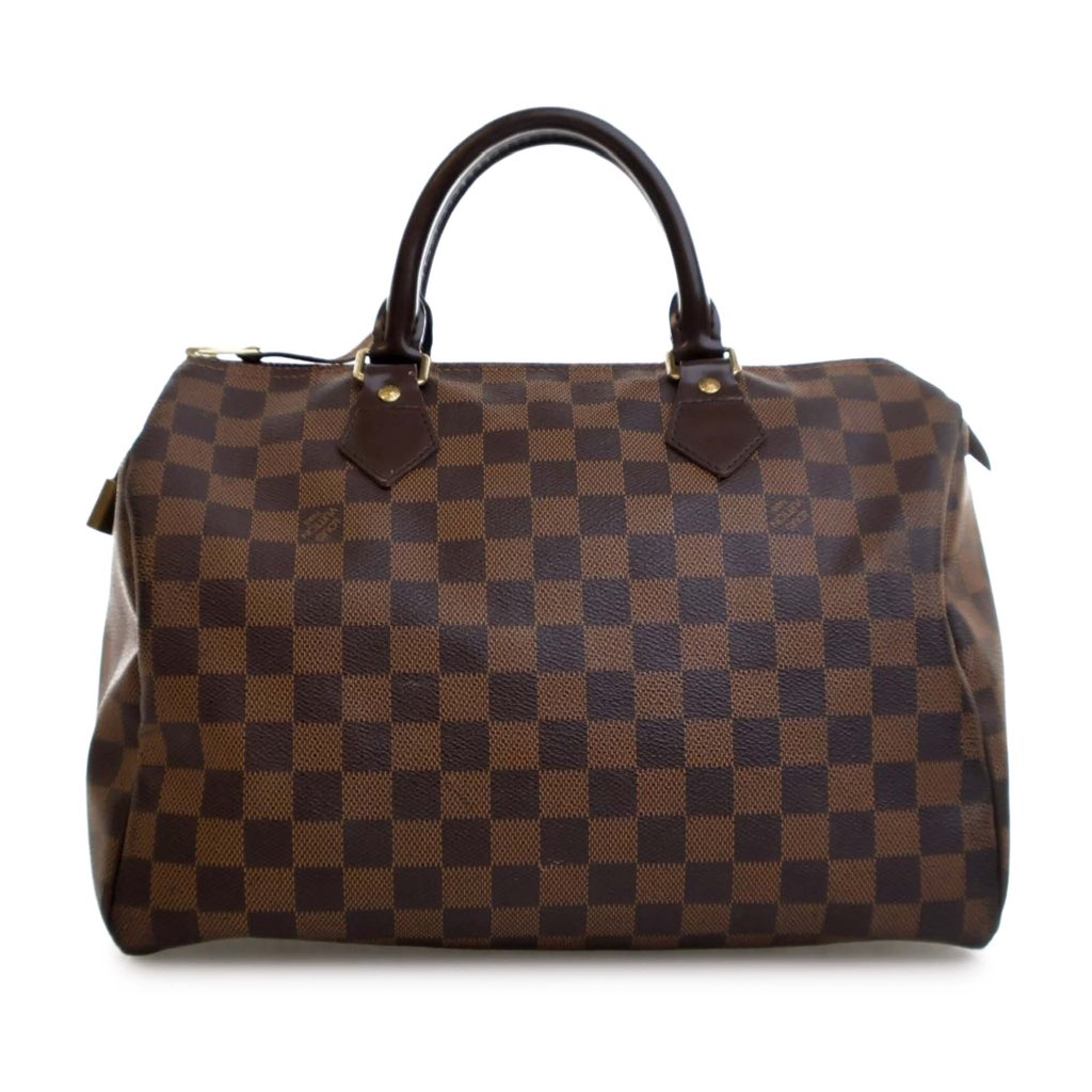 The Speedy 30 features a damier canvas body, rolled leather handles, a top zip closure, and an interior slip pocket.