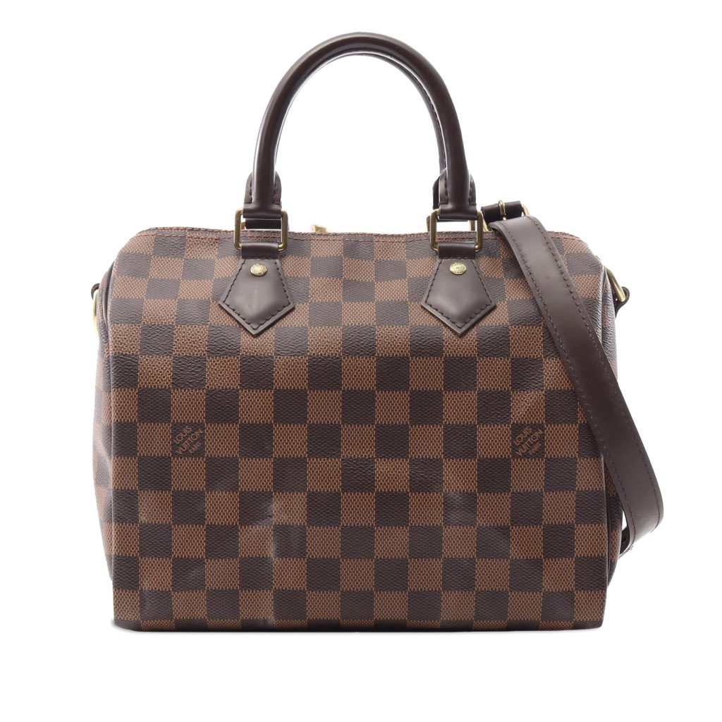 The Speedy Bandouliere 25 features a damier ebene canvas body with leather trim, rolled leather handles, a detachable flat leather strap, and a top zip closure.