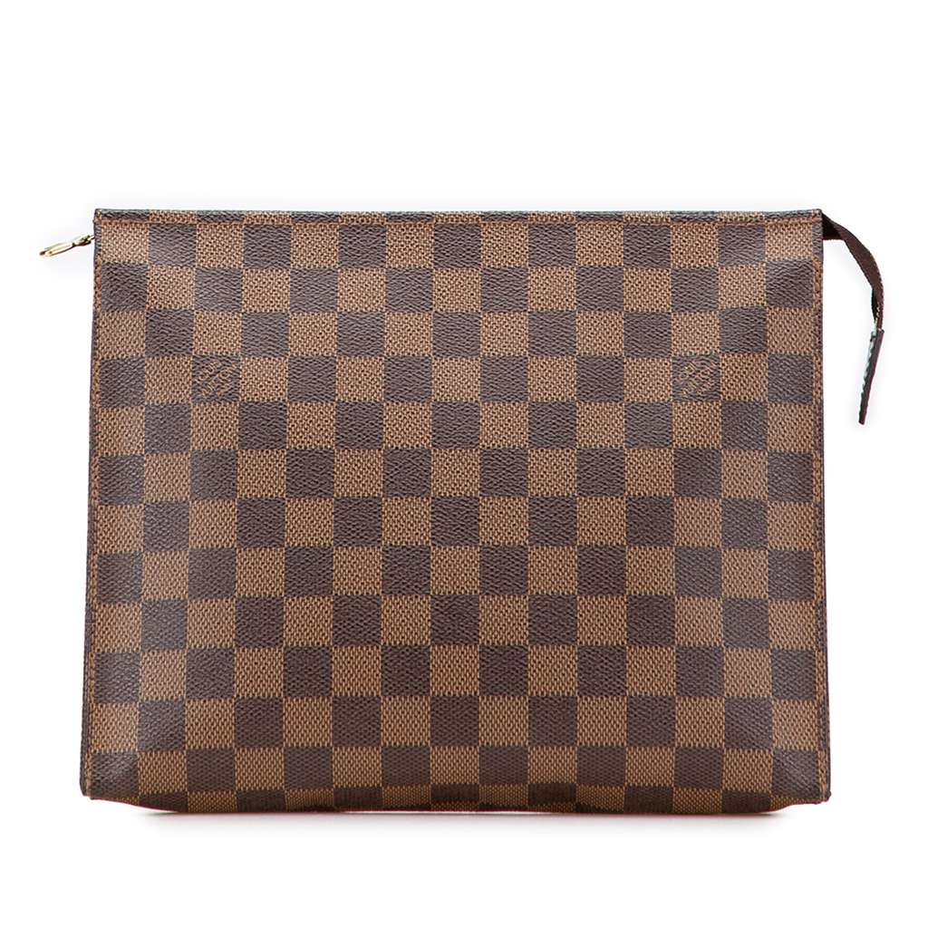 The Toiletry Pouch 26 features a damier ebene canvas body and a top zip closure.