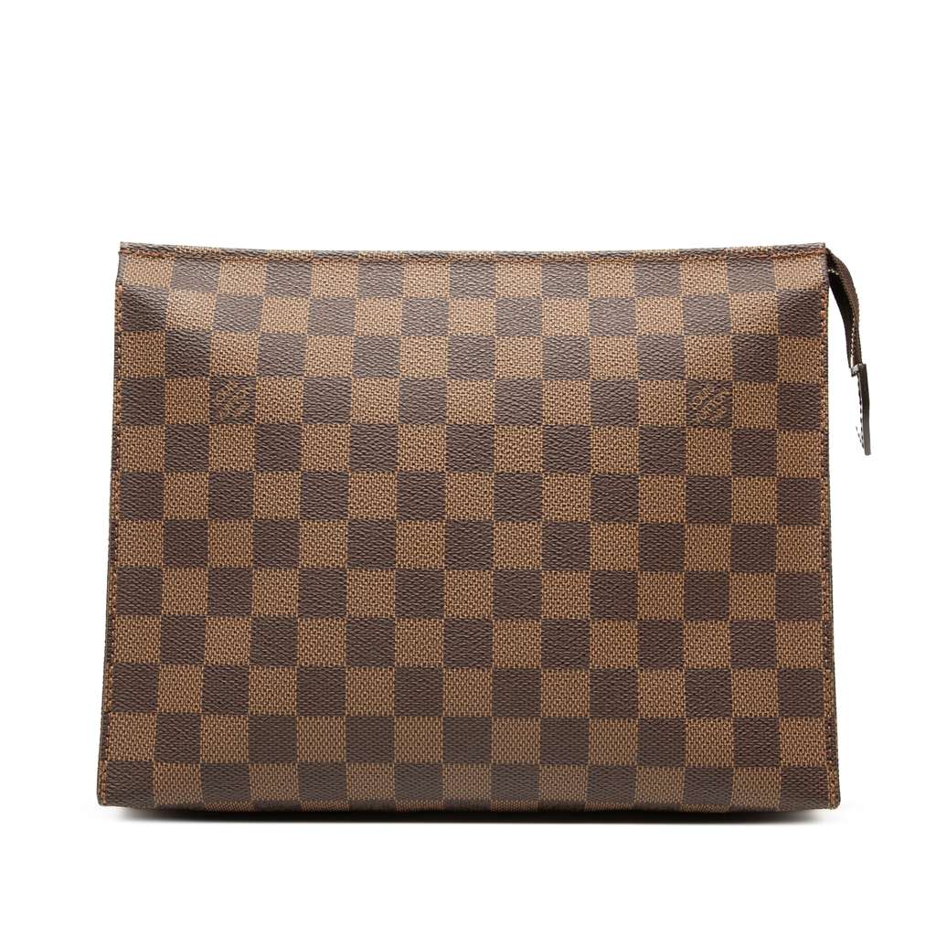 The Toiletry Pouch 26 features a damier ebene canvas body and a top zip closure.